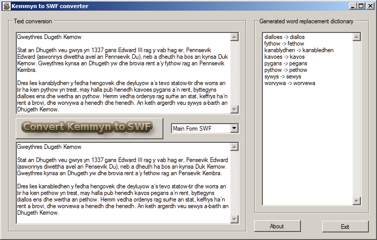 This is the website of Treylyansow, the Cornish software localisation project. If you want to help us, have any questions or would like us to translate your software, please contact us at treylyansow@kernewegva.com. A glossary of common GUI and computer related terms which we have used in previous translations can be downloaded above.